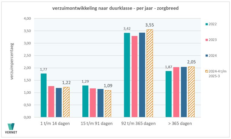 Daarnaast kan de stijging van het verzuim in duurklasse 92 t/m 365 dagen een voorbode zijn voor verdere toename van verzuim in duurklasse >365 dagen.